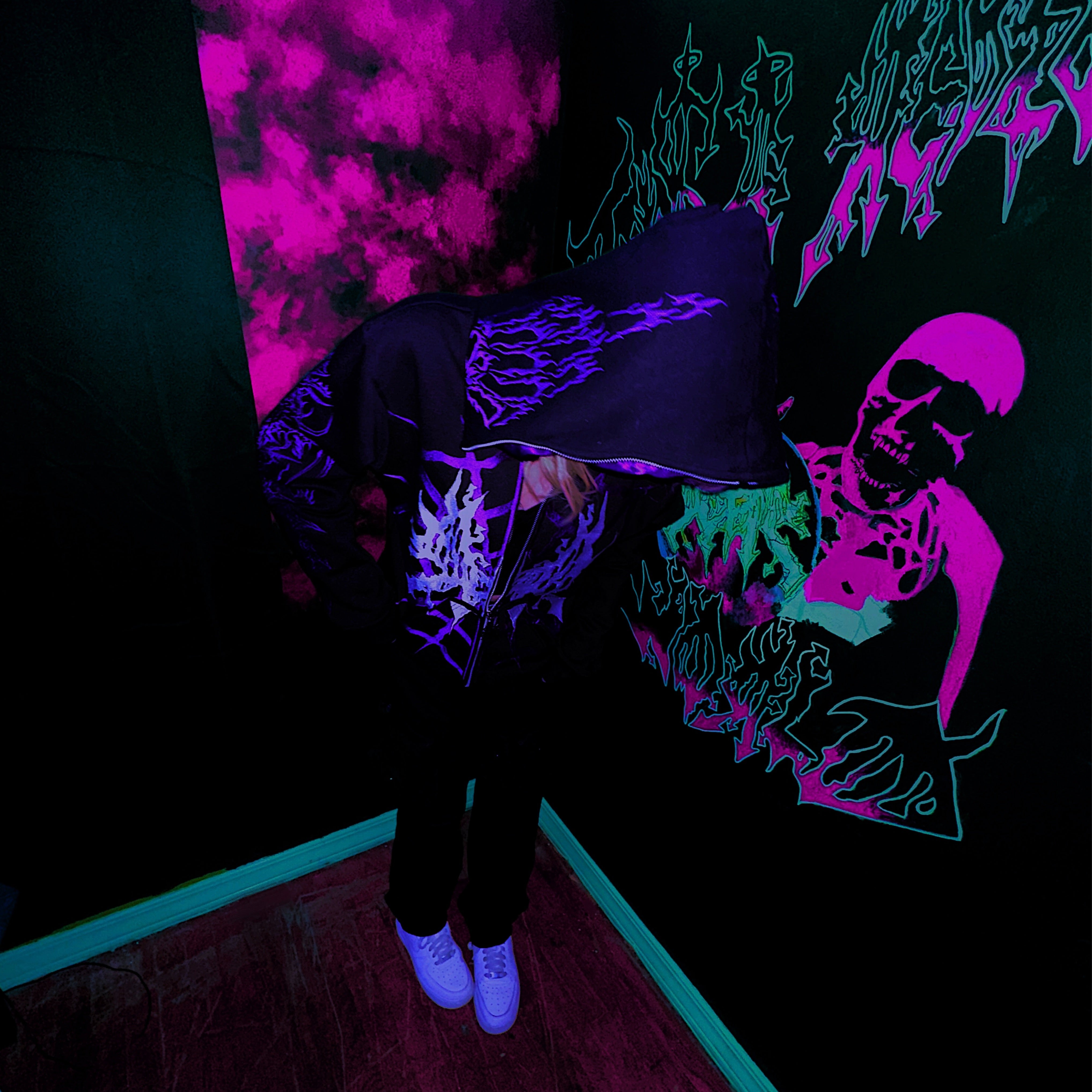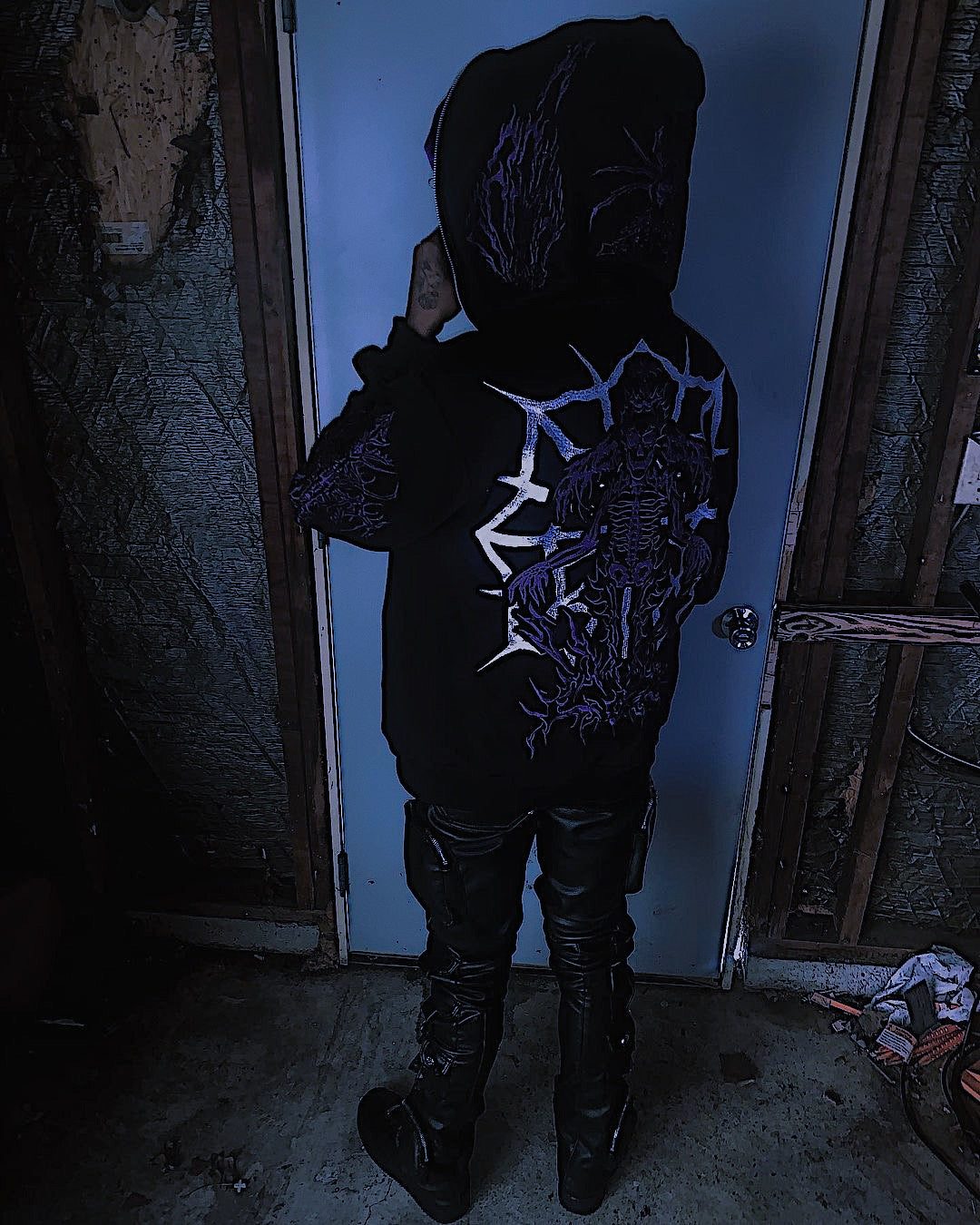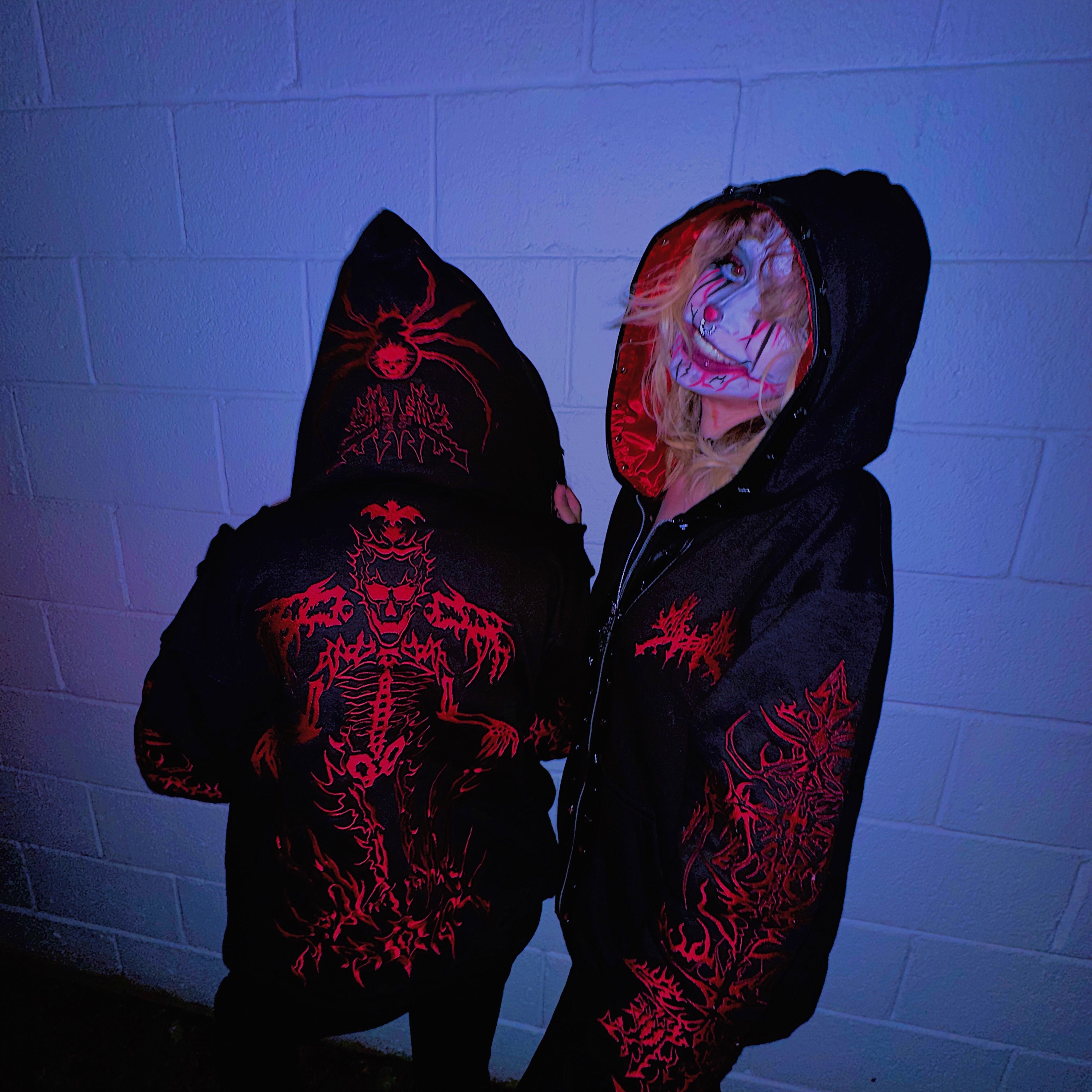 Our new drop is 400 GSM cotton with satin lining , a custom zipper pull , 2 jumbo sleeve prints and a jumbo RZR chest print with a unique use of negative space !